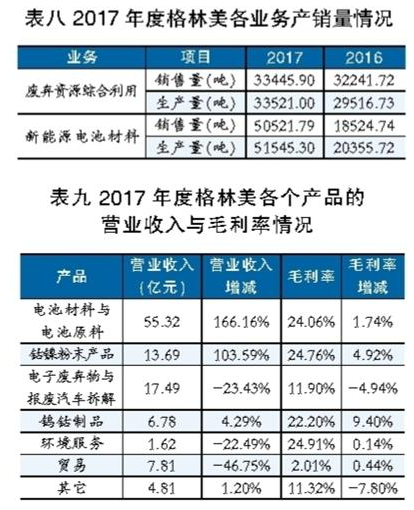 2017年度,格林美鈷相關產品的產銷量大增(見表八),因此,其業績也十分亮眼。其實現營業收入107.52億元,增長37.22%;利潤總額7.95億元,增長123.47%;歸屬于上市公司股東凈利潤6.1億元,增長131.42%。其中,電池材料與電池原料業務板塊(主要是硫酸鎳、硫酸鈷、四氧化三鈷、三元前驅體、三元正極材料、鈷酸鋰等)實現營業收入為55.32億元,增長166.16%,貢獻毛利額13.31億元(見表九);鈷鎳鎢粉末與硬質合金產品業務板塊實現營業收入20.48億元,增長54.76%,貢獻毛利額4.9億元;可見,鈷相關產品回收與再利用已經是格林美營收和利潤的主要來源。