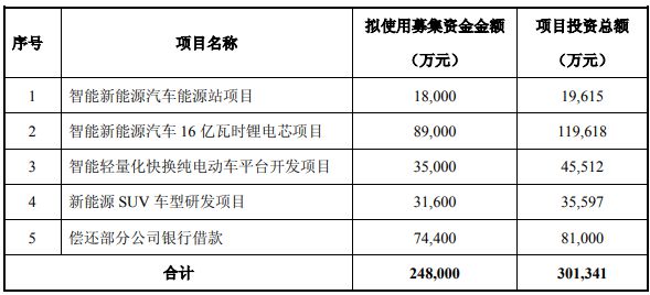 力帆股份5月6日晚間發布非公開發行A股股票預案,擬募集資金總額不超過24.8億元,用于投資智能新能源汽車能源站、智能新能源汽車16億瓦時鋰電芯、智能輕量化快換純電動車平臺開發等項目,以及償還銀行借款(見下表)。