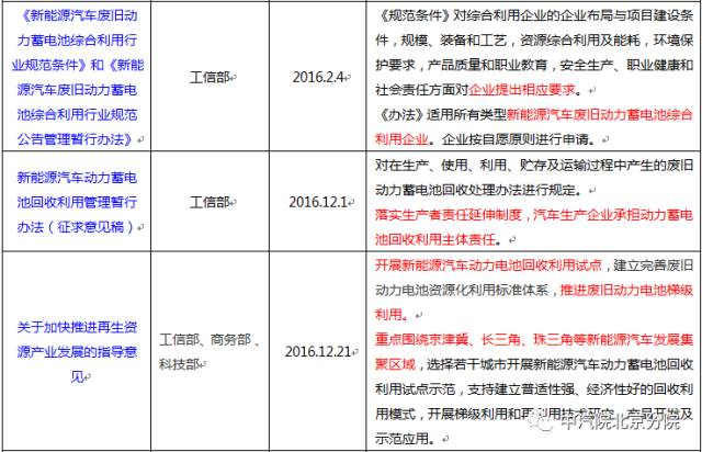 近年來,在國家政策的引導(dǎo)和推動(dòng)下,我國新能源汽車產(chǎn)業(yè)發(fā)展迅速,隨著新能源汽車逐漸進(jìn)入報(bào)廢期,車用動(dòng)力電池的回收利用問題也會(huì)越來越突出。政府高度重視動(dòng)力電池回收利用的工作,已經(jīng)出臺(tái)多項(xiàng)相關(guān)政策來推動(dòng)動(dòng)力電池回收利用產(chǎn)業(yè)的發(fā)展(見表1)。