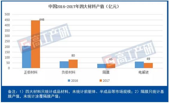 高工產研鋰電研究所(GGII)數據顯示,2017年中國四大關鍵材料產值620億元,同比增長65%。正極材料產值占比最大,達71.9%。四大關鍵材料中,正極材料產值增幅最大,主要系2017年電解鈷漲幅超過100%,碳酸鋰價格漲幅超過30%,使正極材料價格大幅上漲。