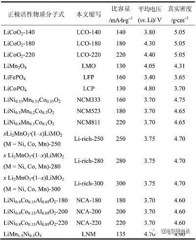 表1計(jì)算所用正極活性物質(zhì)及其比容量、電壓