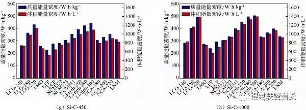 圖29(a)-(j)展示了10種不同負(fù)極與16中正極材料組合形成的電芯的能量密度的計(jì)算結(jié)果。圖2(i)標(biāo)明,Li-rich-300對Si-C-2000的電芯體系,所有的電池體系中具有最高質(zhì)量能量密度584Whkg-2,以及最高的體積能量密度1645WhL-1(不包括封裝材料和極耳)。