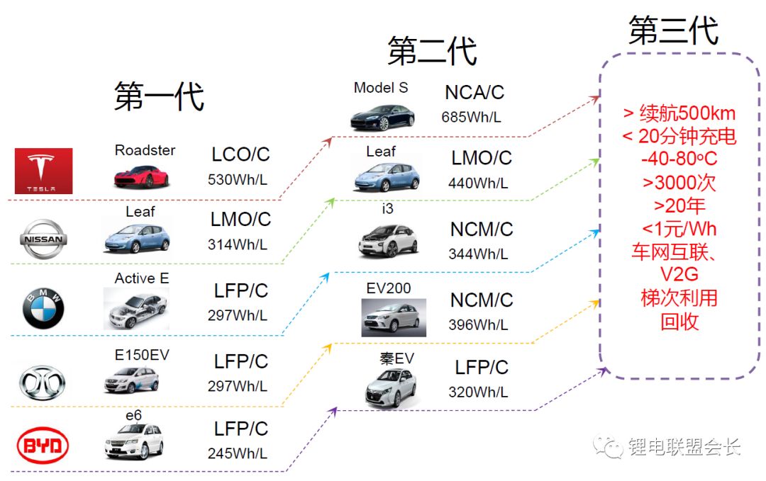 每一次電池性能的顯著提升,本質(zhì)上都是電池材料體系的重大變革。從第一代的鎳氫電池和錳酸鋰電池,第二代的磷酸鐵鋰電池,到目前廣為采用且預(yù)計持續(xù)到2020年左右的第三代三元電池,其能量密度和成本分別呈現(xiàn)出階梯式上升和下降的明顯趨勢。因此,下一代車用電池選用何種電池體系,對于實現(xiàn)2020~2025年的電池目標(biāo)至關(guān)重要。